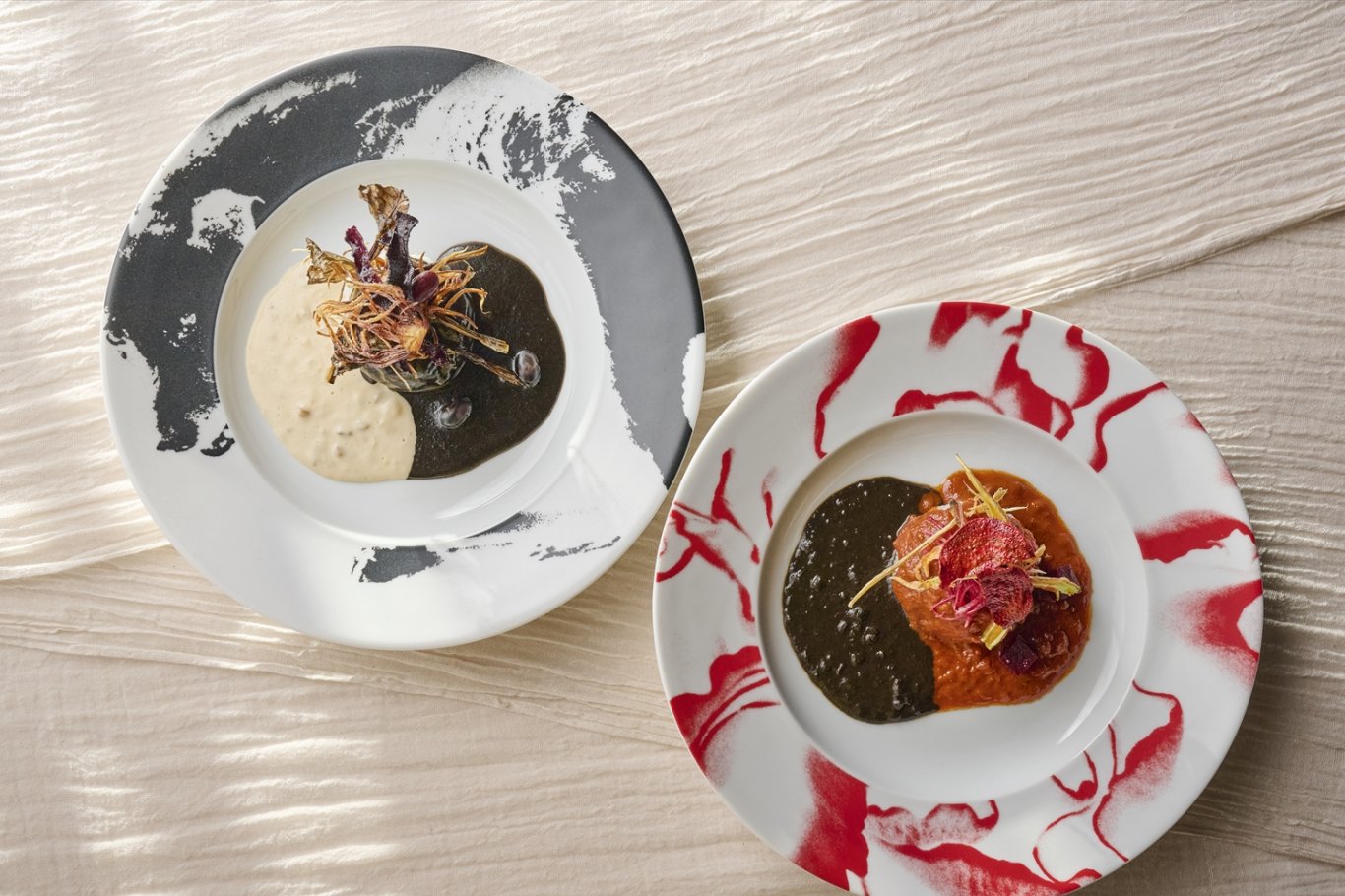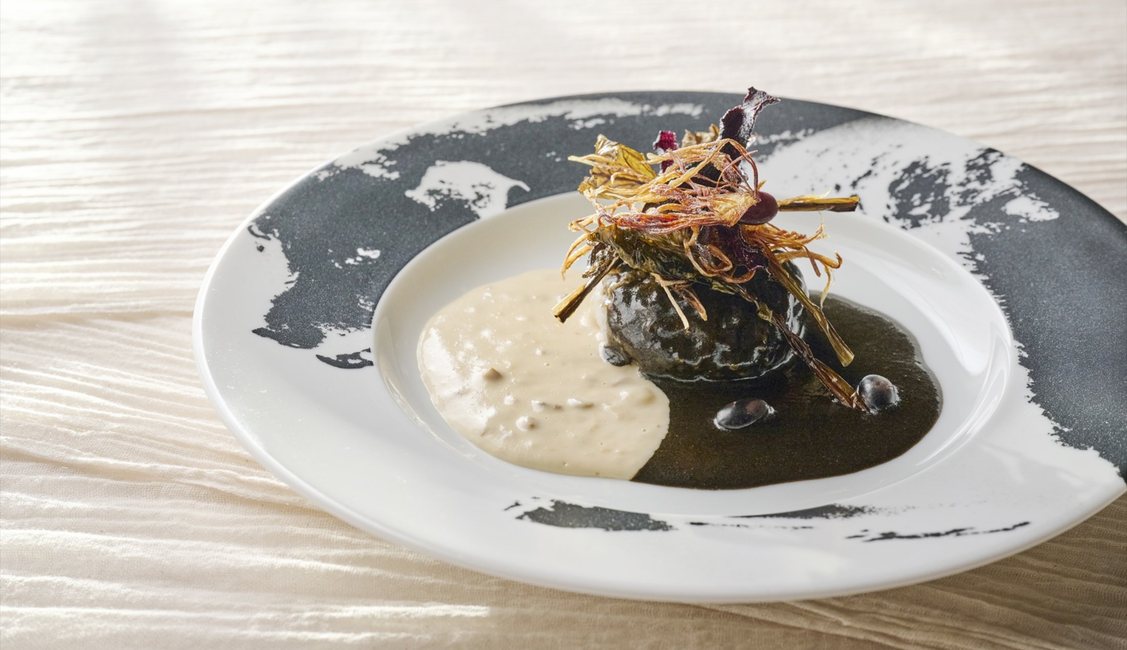 黒と白2色のソースで味わう